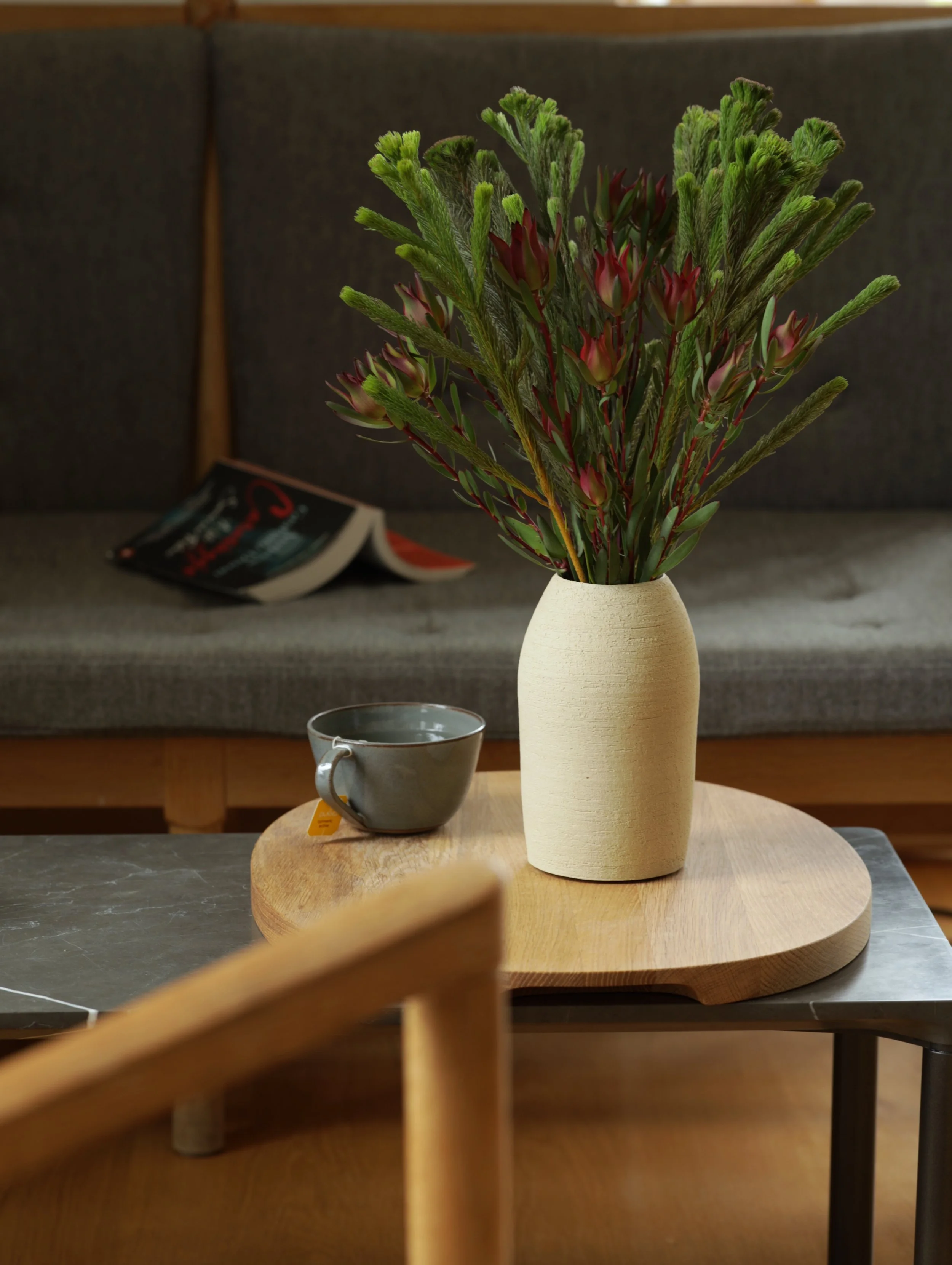 Wheel thrown functional tableware, each piece has been made by Sarah Dannesboe using a variety of local stoneware clay showing different textures and colours. After studying glaze chemistry, Sarah developed her own palette of durable, food-safe glazes reflecting the colours of the ever changing local seascape.